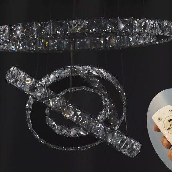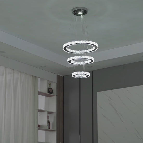 Elevate your space with our modern CRYSTAL HALO CHANDELIER. With 3 customizable rings and dimmable LED light in 3 color options, this chandelier offers a perfect ambiance for any room. Made with stainless steel and K9 crystal, it adds a touch of sophistication to your space.